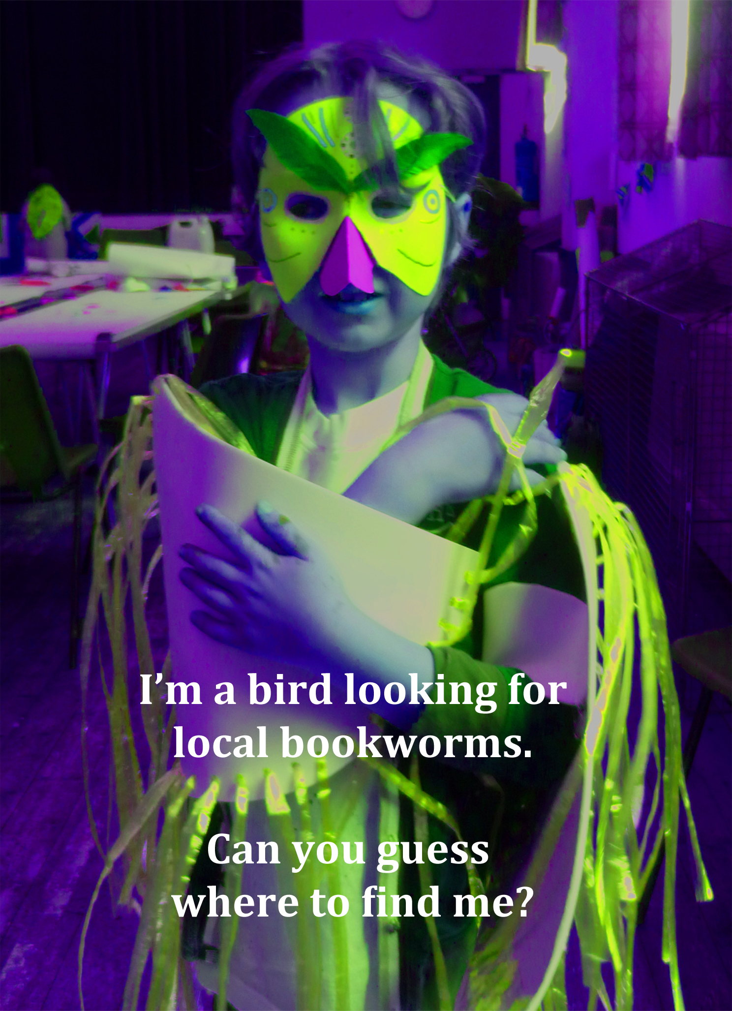 One of the clues posted in local shops. Image of young person in bird costume made during the ‘birdies Trail’ project for the book ‘We Can Fly’ – created by Chris Culshaw. I worked with families to make costumes and masks that formed the images to accompany stories in the book.