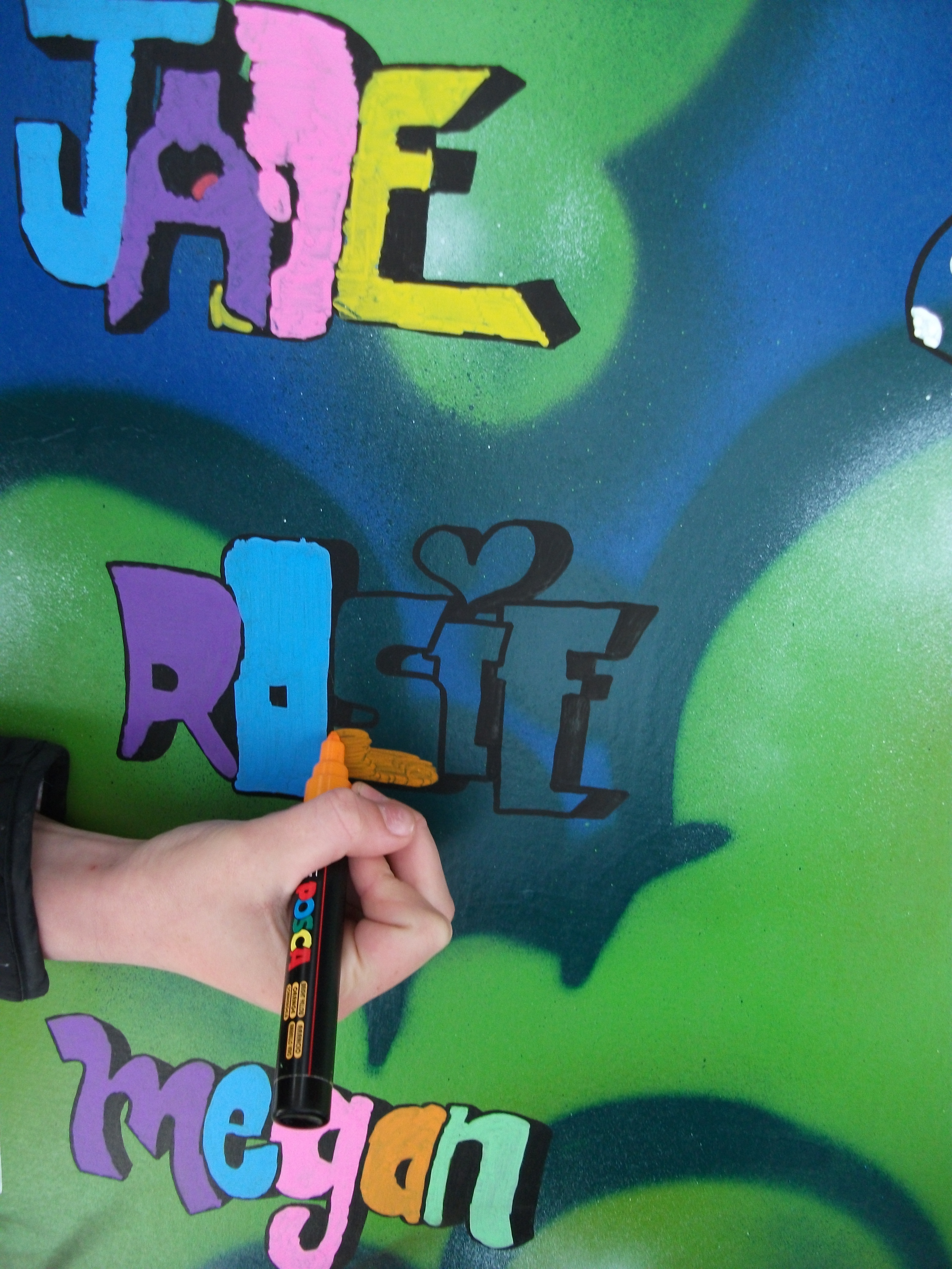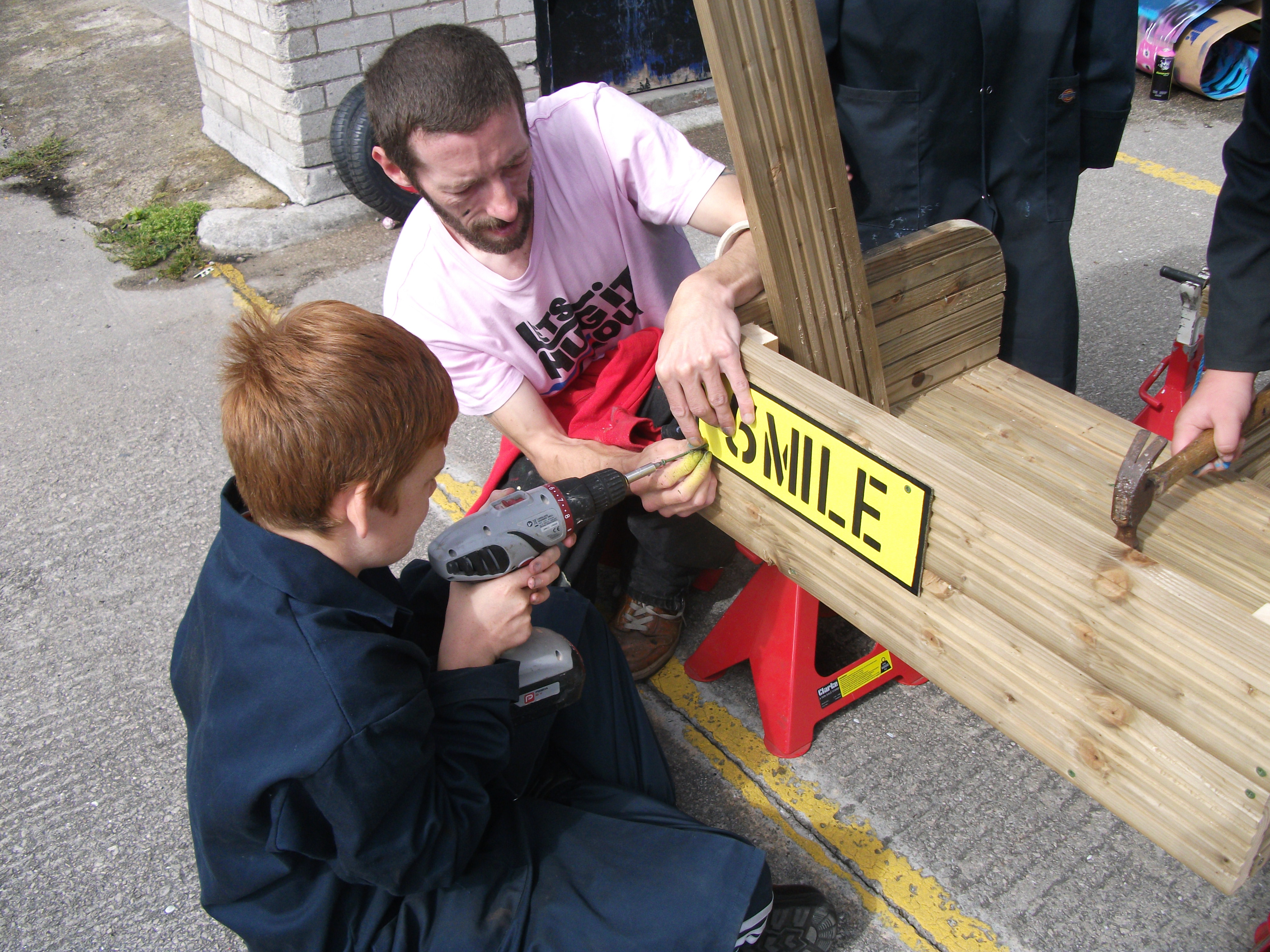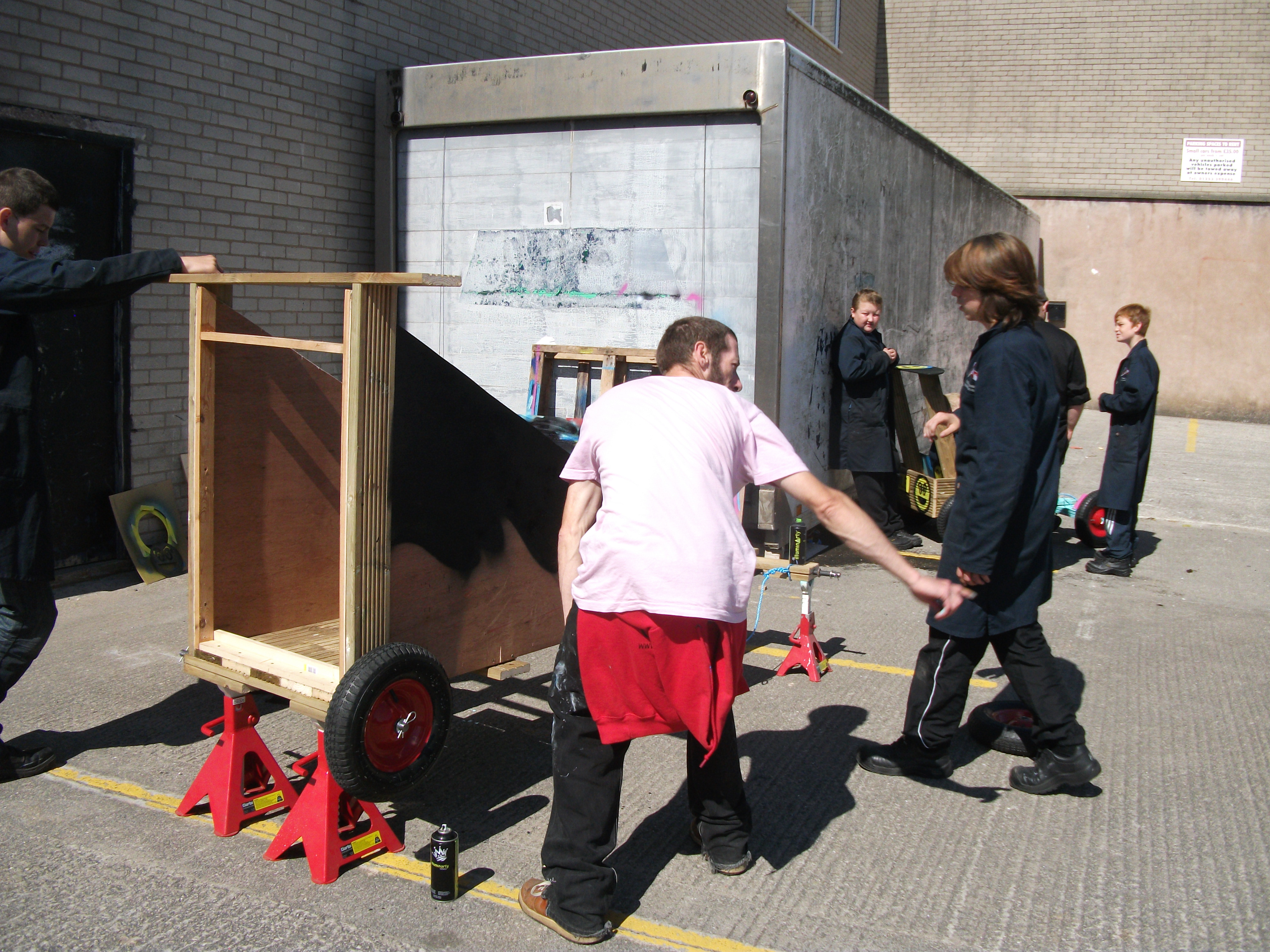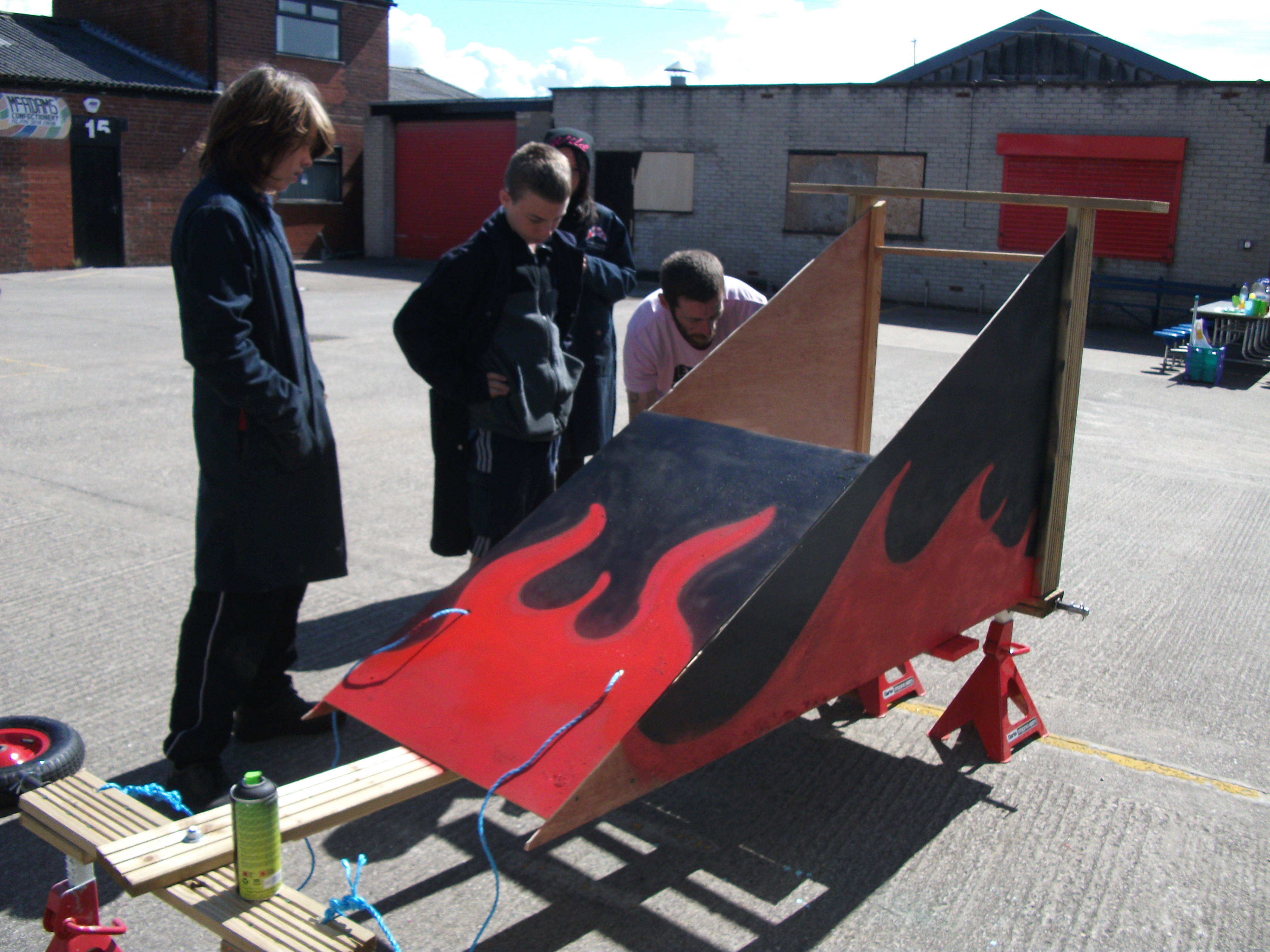 Boz worked with the two teams while they built the machines ready for racing on day three. while Mr Dee helped design and paint the custom graffiti on the finished karts.