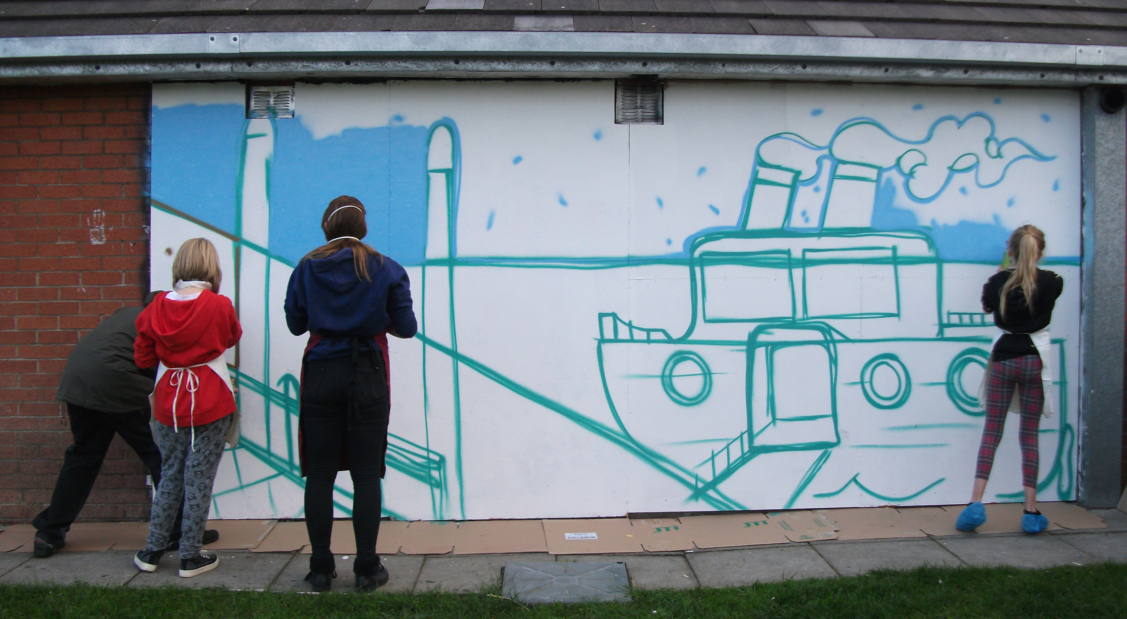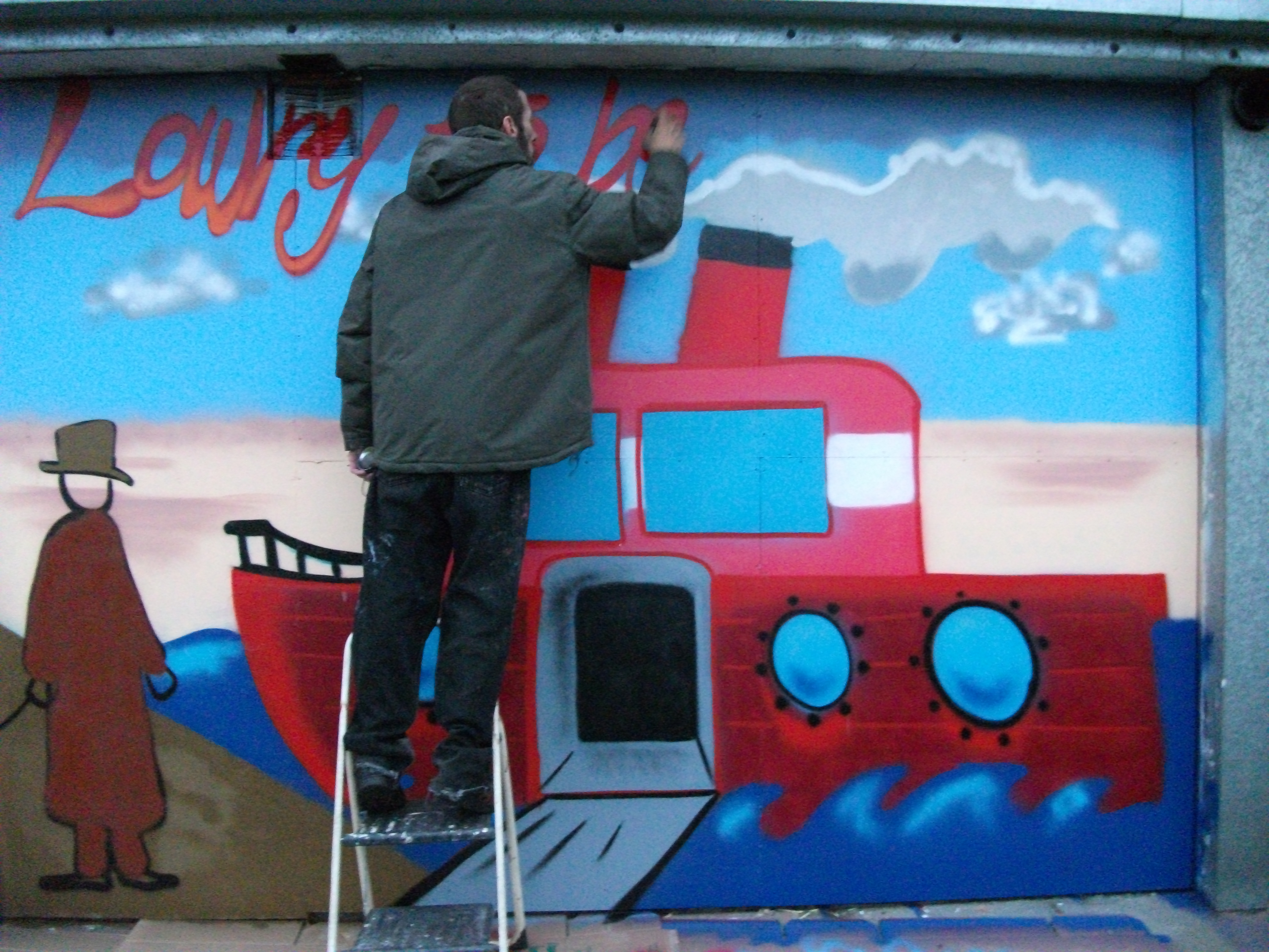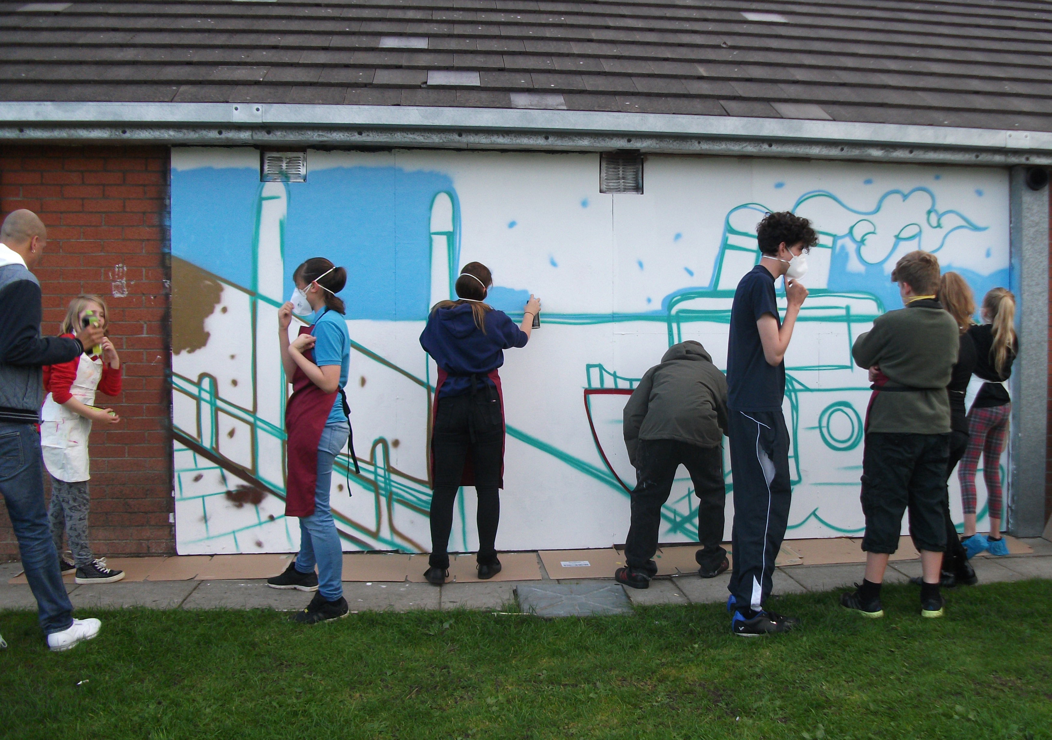 Based on the design done by a member of the Preesall Youth club we worked with a lovely group of young people to create a Lowry themed graffiti painting