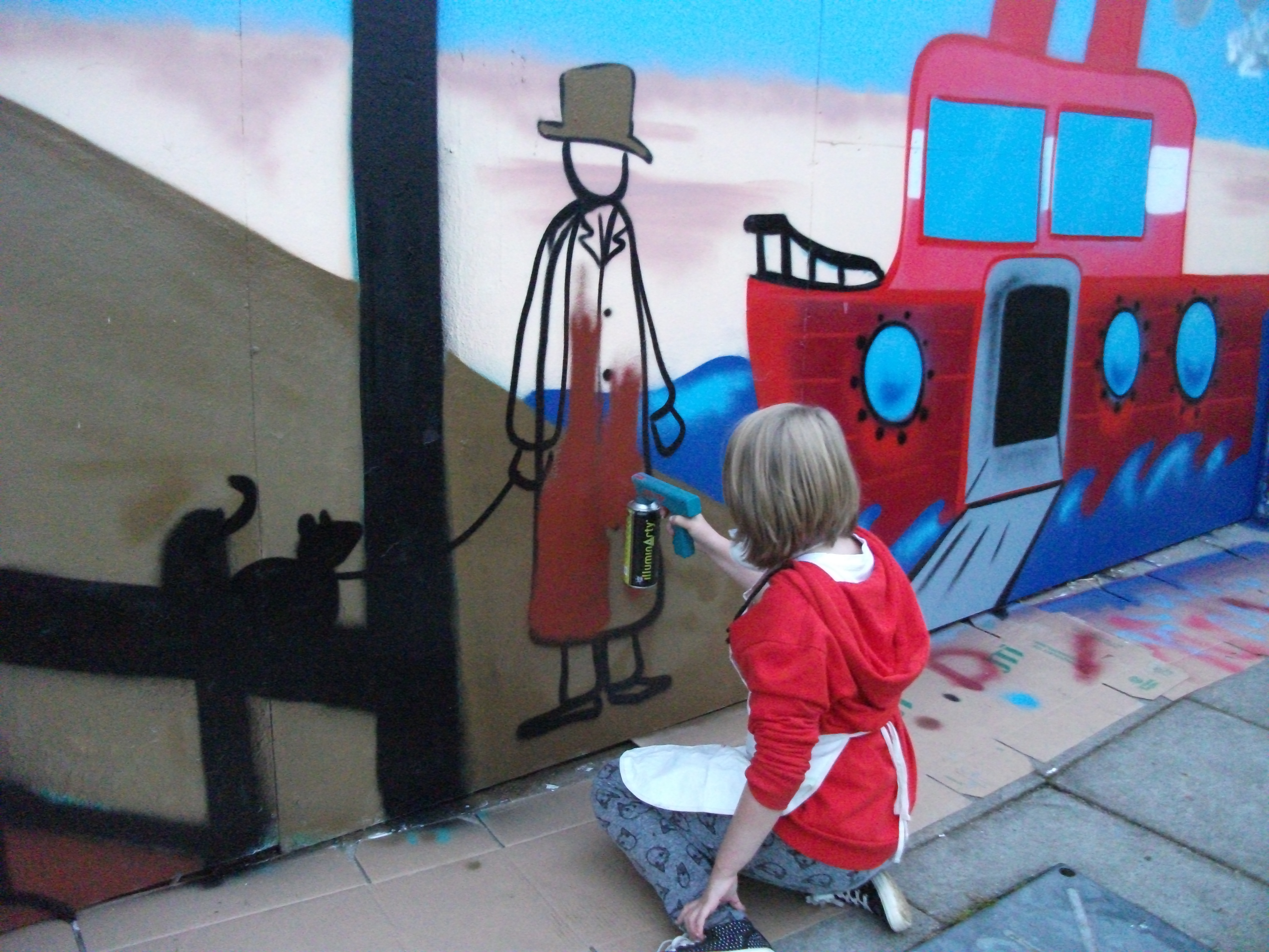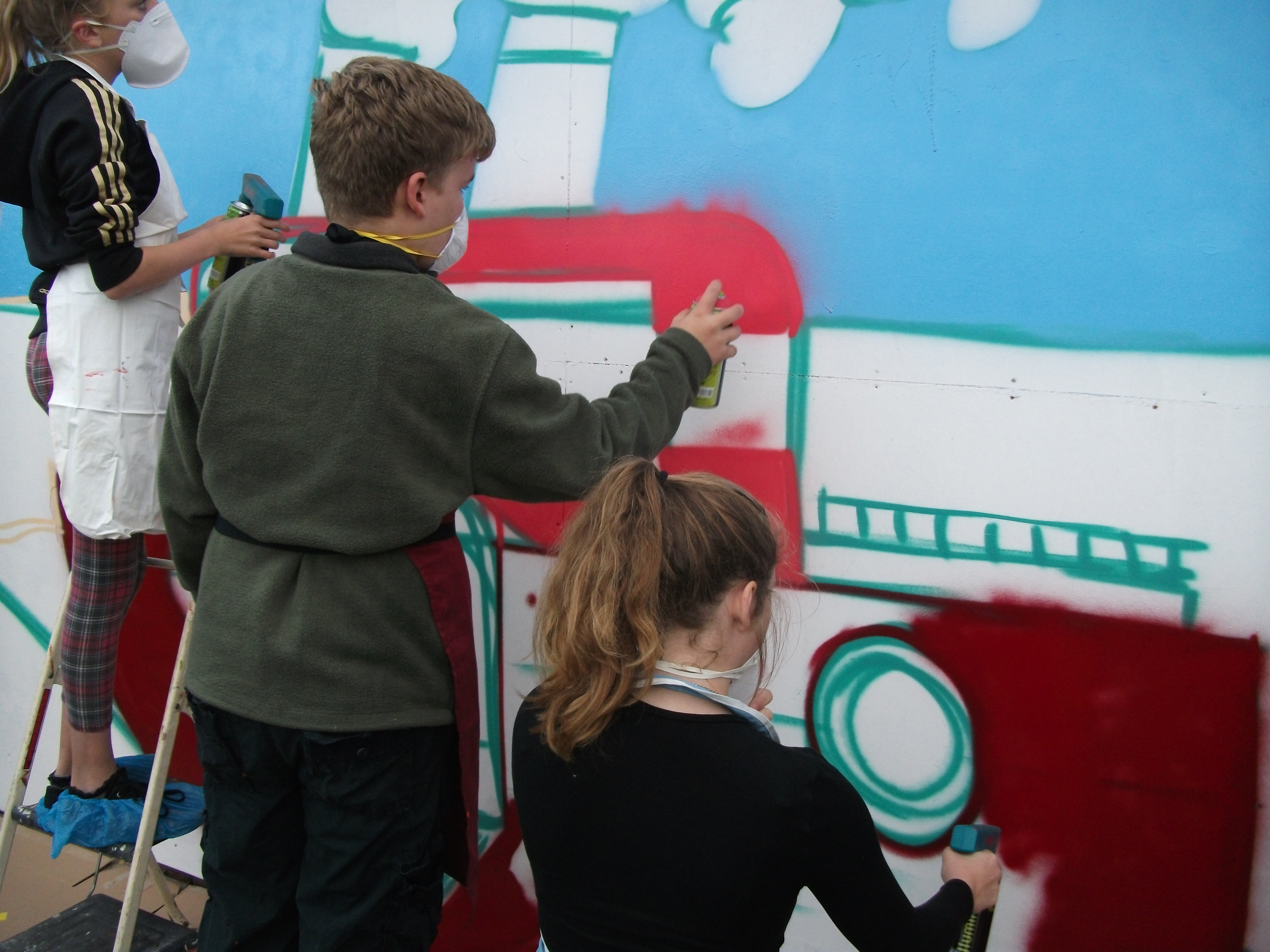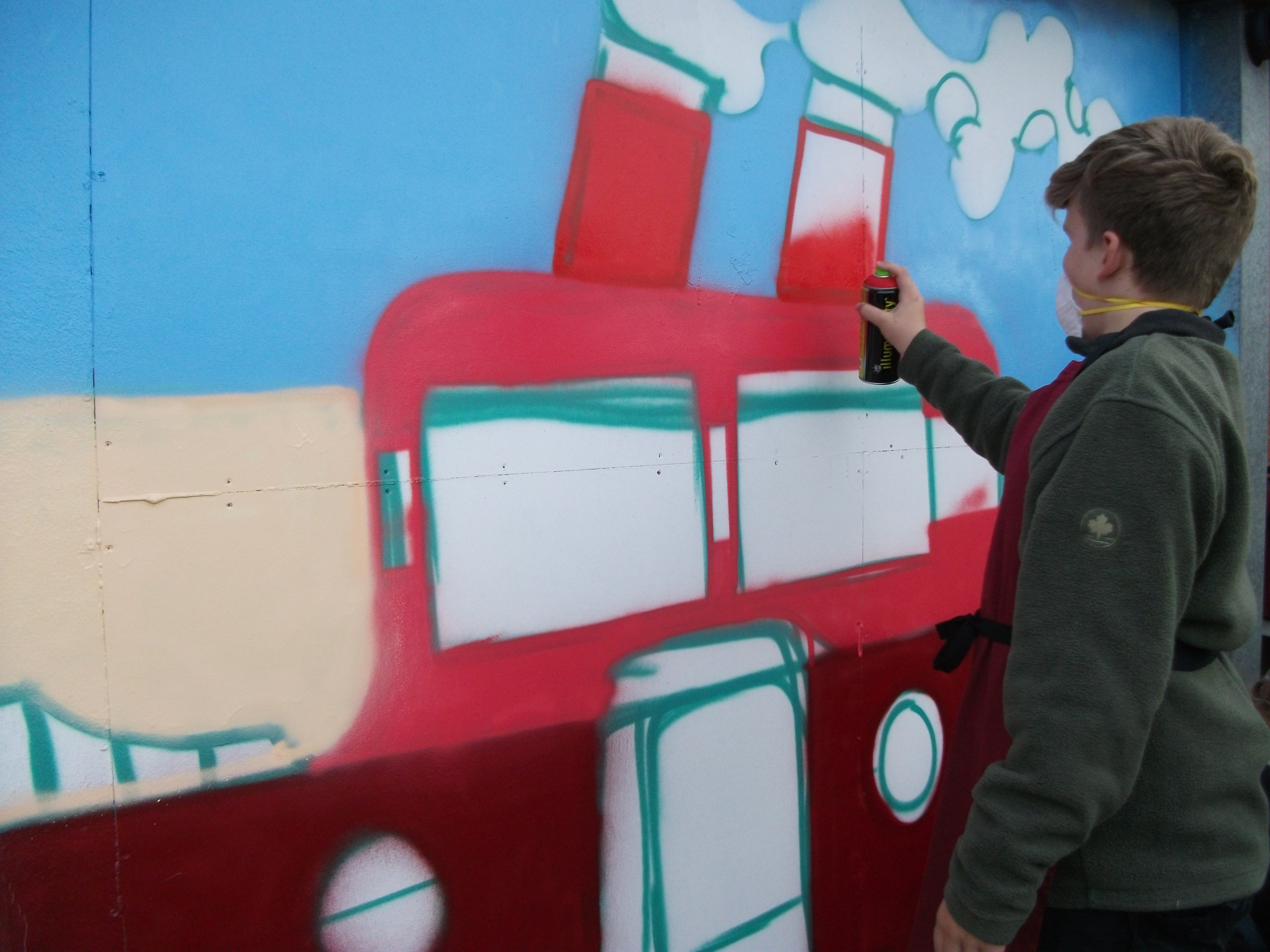Based on the design done by a member of the Preesall Youth club we worked with a lovely group of young people to create a Lowry themed graffiti painting
