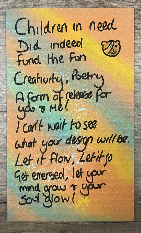 ·’I felt like I could speak to Boz and Lee about my struggles whilst doing Art, this really helped my mental health, before then I didn’t realise how much it would help, I wish I started doing Art sooner, I find it as a form of therapy.’
