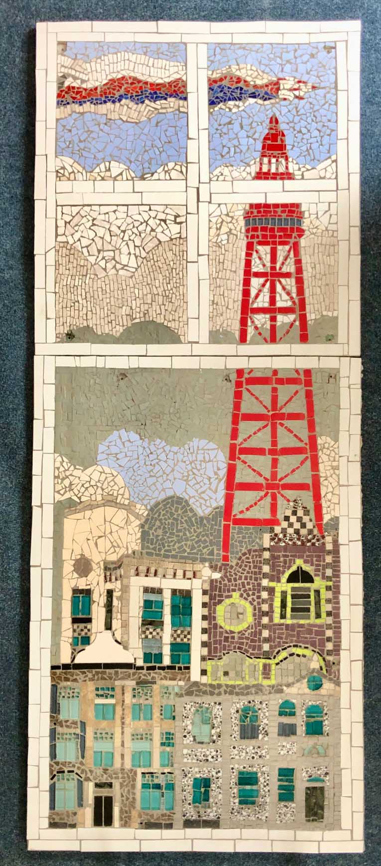 The art work was designed by Mr Dee using the iconic local buildings of Blackpool to inform the work, as discussed and designed with Revoe residents, who worked on the mosaic over a number of years using recycled tiles, donated by Al Murad Tiles.