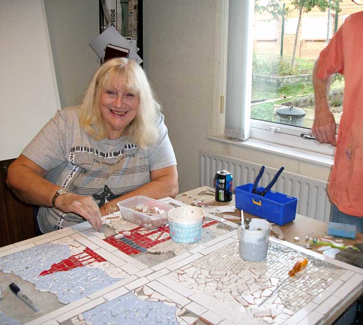 After what seemed like the longest time ….. we are now back working on the amazing mosaic, at Mary Smith House with Revoe residents. We will be there for the next 3 sessions on Tuesdays between 5-7pm.