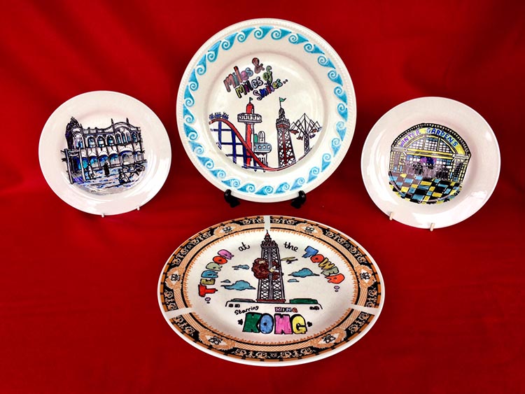 items such as these beautiful Blackpool themed plates are now available prices start at £3: half the money will go to the community center the other half to the lifeboats.