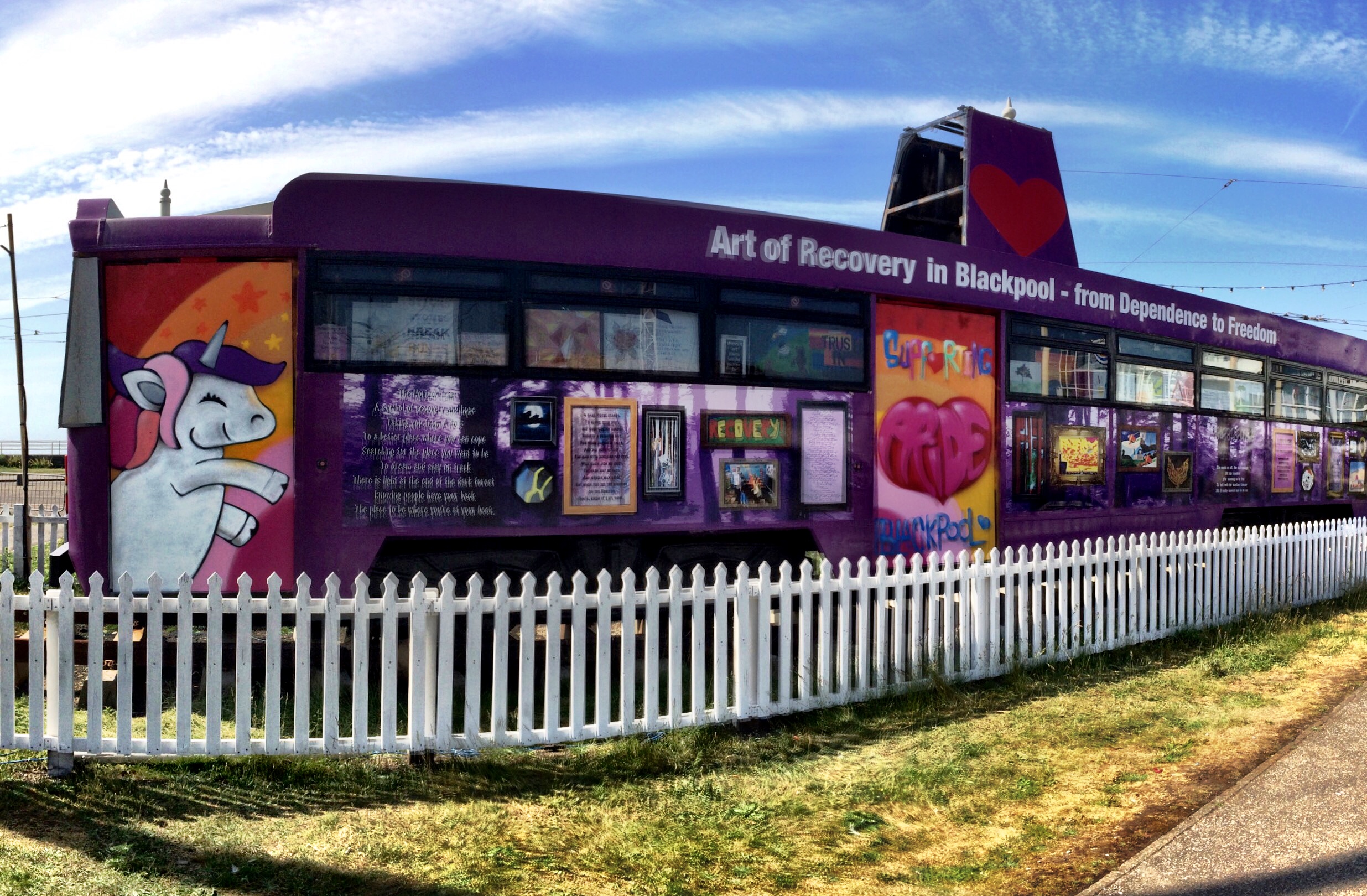 We have been spray painting these portraits on the Recovery Tram: working with Blackpool Horizon Art Club to produce stencil based art work using photographs of participants.