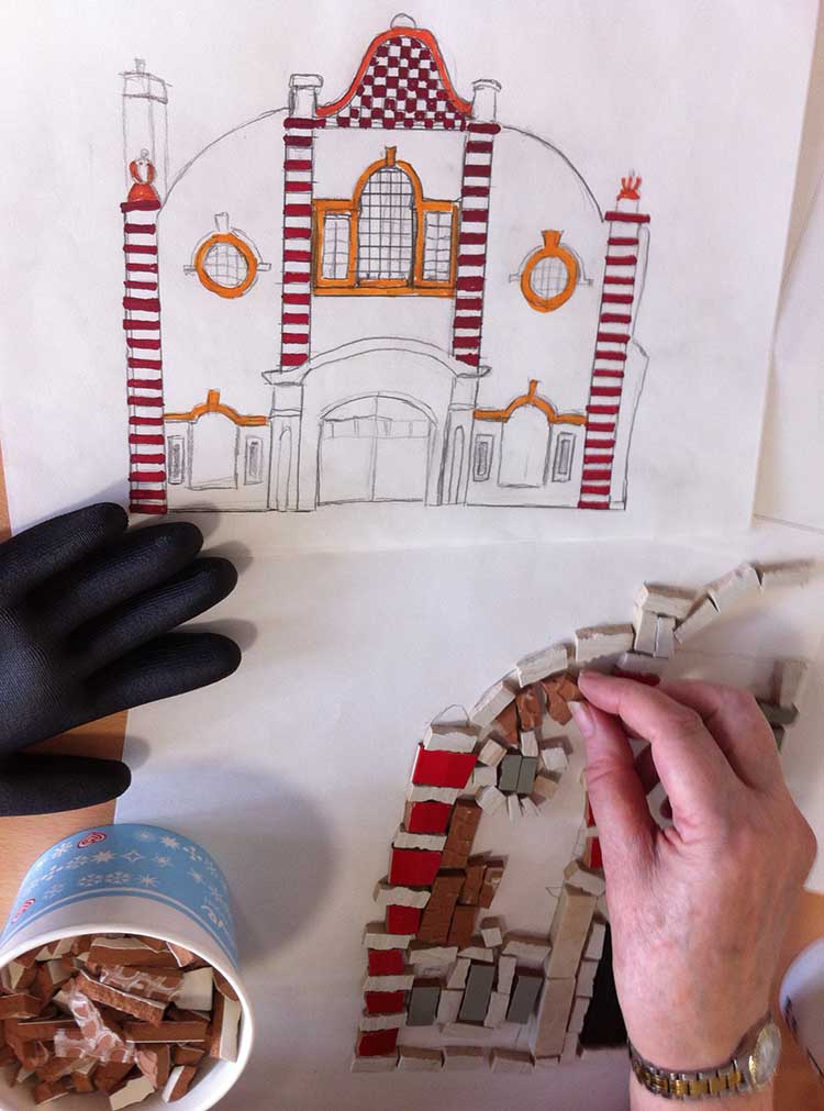 The art work was originally designed, then made to fit within a window space of the now demolished George Hotel, once situated on Central Drive next to the Revoe community center. The mosaic will now take pride of place outside the Mary Smith House, Revoe-lution Community building. The mosaic depicts iconic local landmark buildings including the George Hotel.